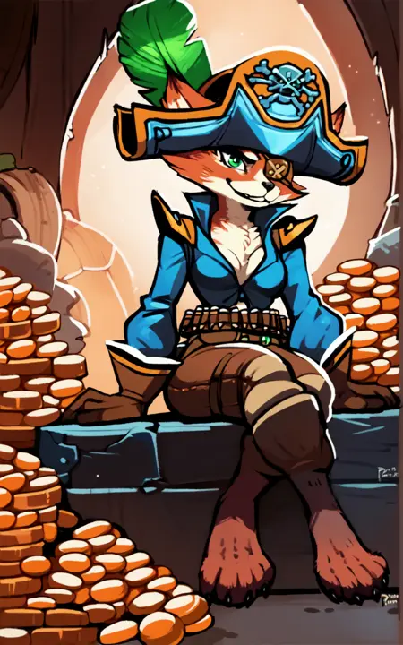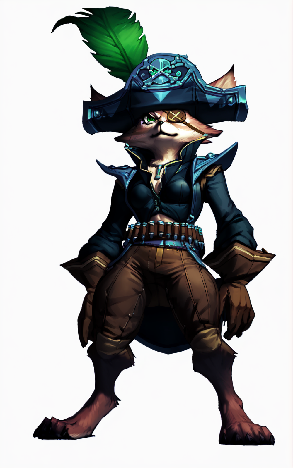 For her Outfit: belt, pants, brown pants, long sleeves,eyepatch, hat, brown gloves, pirate hat, pirate, hat feather, dark blue coat**