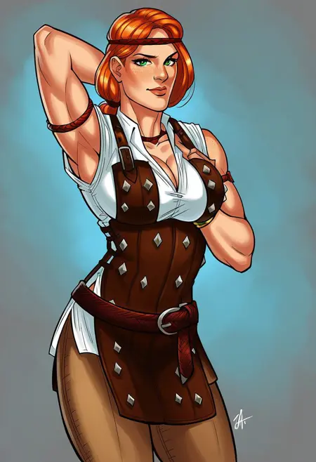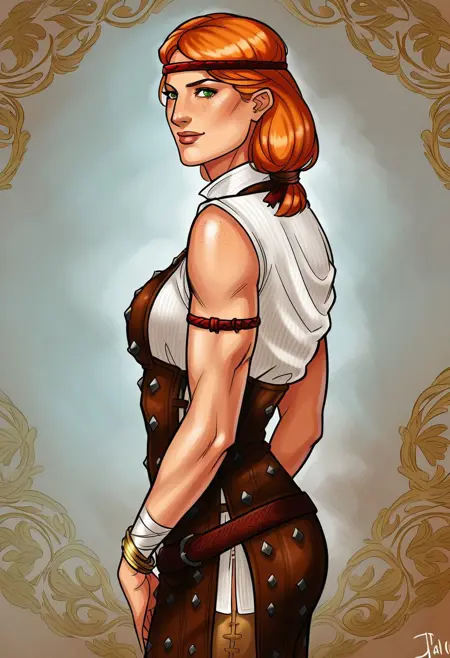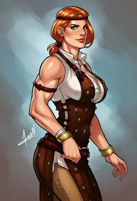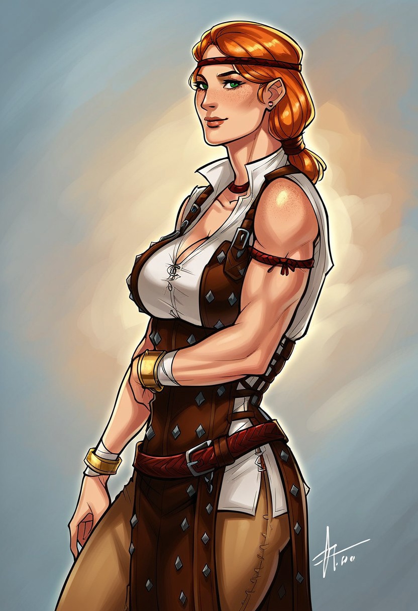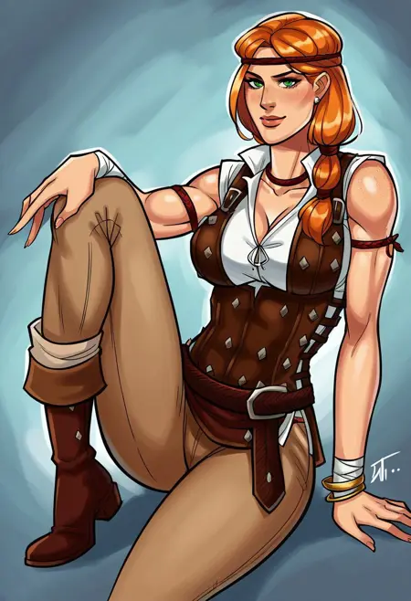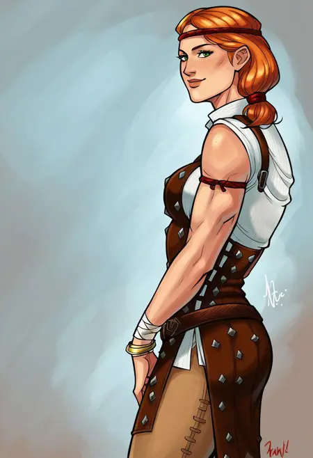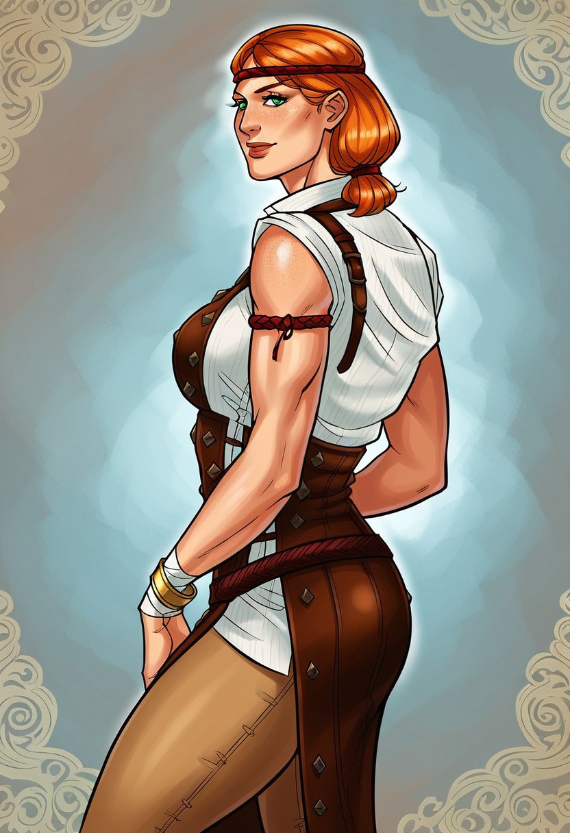 Aveline Vallen,1girl,solo,orange hair,freckles,green eyes,large breast,headband,boots,pants,bracelet,cleavage,belt,lips,shirt,armor,necklace,sleeveless,choker,armlet,anklet,vest,biceps,