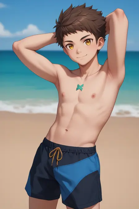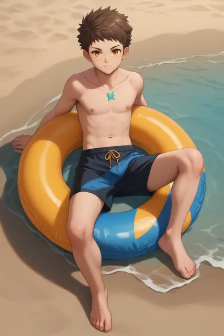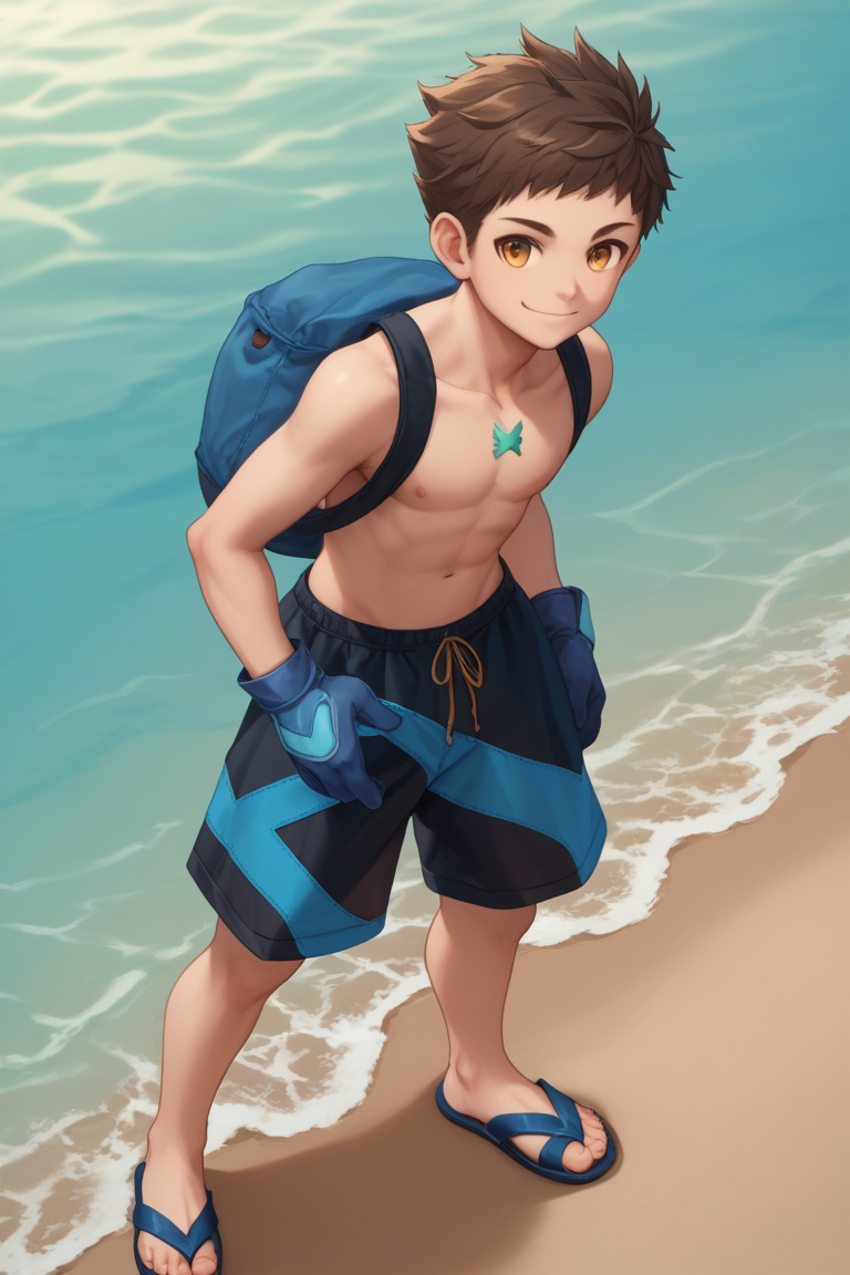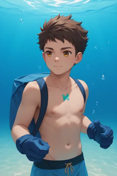云海鲨鱼:男性泳装,泳裤,蓝色手套,凉鞋,赤裸上身男性,背包