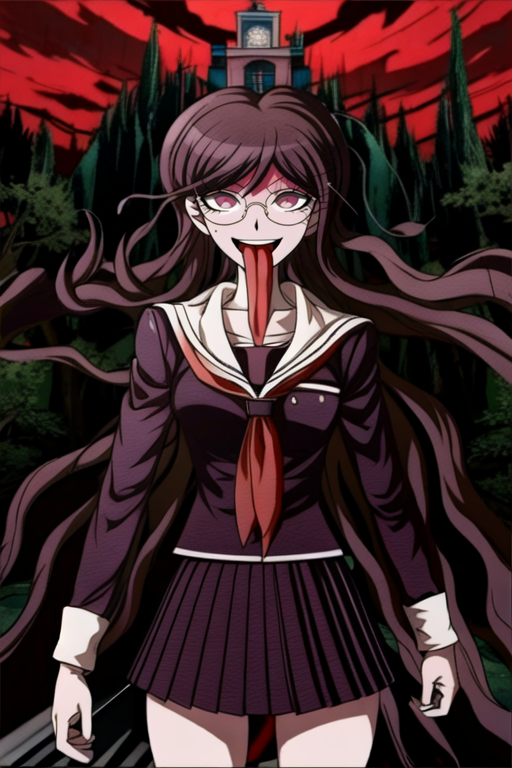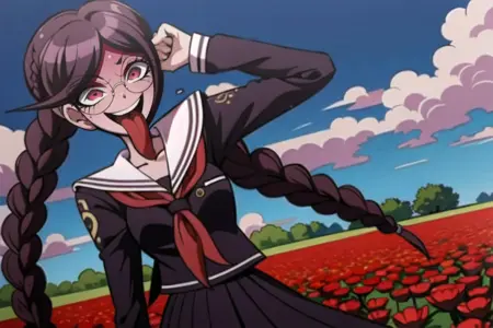 標準服(ジェノサイダー・ショウ):「Genocider Sho, Danganronpa 1 uniform, tongue out, red eyes, braids」