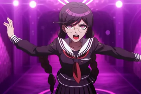 標準服(トコ):「Toko Fukawa, 1girl, uniform, purple uniform, pleated skirt, sailor collar, red ribbon, school crest, dark purple hair, braids, glasses, white socks, brown loafers, full body shot」