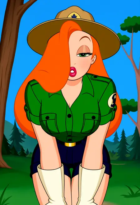 公园护林员提示词:jessicaranger, hat, green shirt, short sleeves, shorts, belt, white gloves, ranger uniform