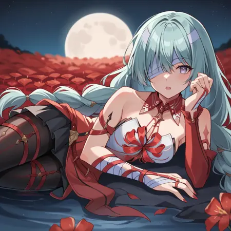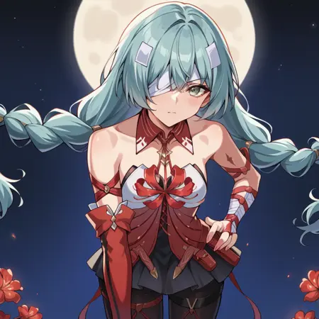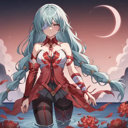 Phrolova, aqua hair, long hair, twin braids, grey eyes, low twintails, one eye covered, bandage over one eye,