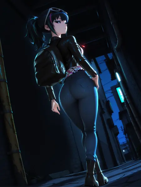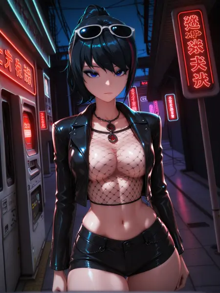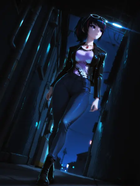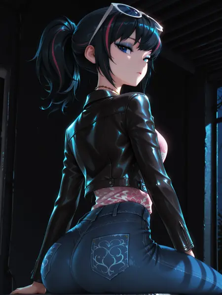 Outfit Prompts : jacket, eyewear on head, sunglasses, leather jacket, black jacket, pants, denim pants, shirt, open jacket, boots, necklace, long sleeves