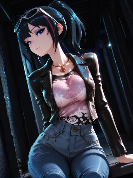服装提示词:夹克, 头戴眼镜, 太阳镜, 皮夹克, 黑色夹克, 裤子, 牛仔裤, 衬衫, 开襟夹克, 靴子, 项链, 长袖