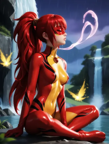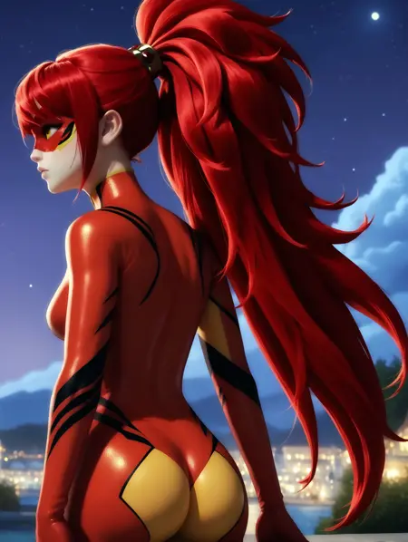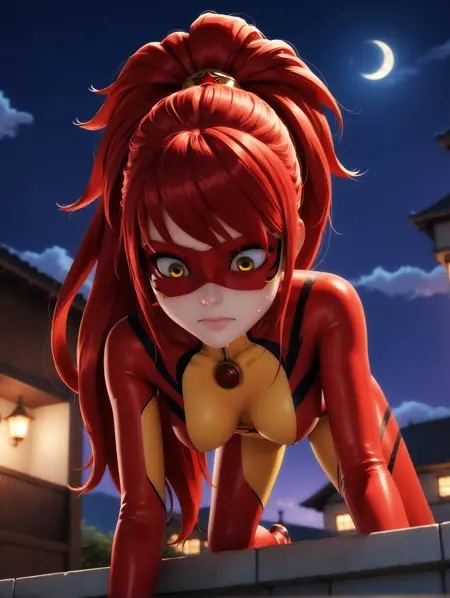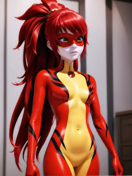 プロンプト:1girl, bodysuit, red hair, long hair, ponytail, mask, domino mask, yellow eyes, green eyes, bangs, multicolored bodysuit, red bodysuit, yellow bodysuit