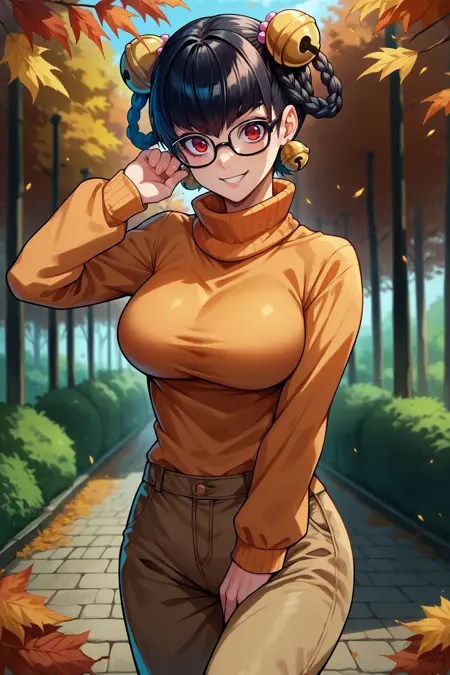 彼女の典型的な外見には、「髪の鈴、イヤリング、白いスカーフ、中国風の服、赤いシャツ、ノースリーブ、肘までガーブ、白いズボン、ゆったりしたズボン」を追加してください。