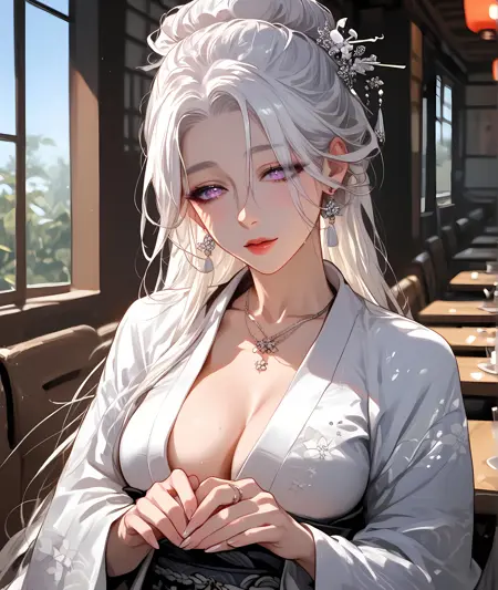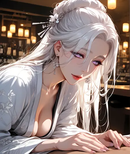 long hair, very long hair, sidelocks, white hair, light violet eyes, forehead, mole, white hair ornament, hair bun, white kimono, light violet nails,