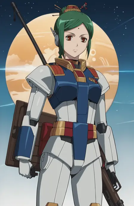 Gundam Tama, beam rifle, shield, energy 1gun, robot, green hair, hairbun, brown eyes, facial mark, hair ornament
