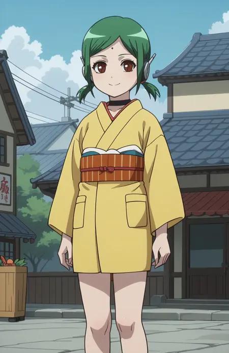 Mini Tama | Green hair, twintails, choker, brown eyes, yellow kimono, robot ears, young