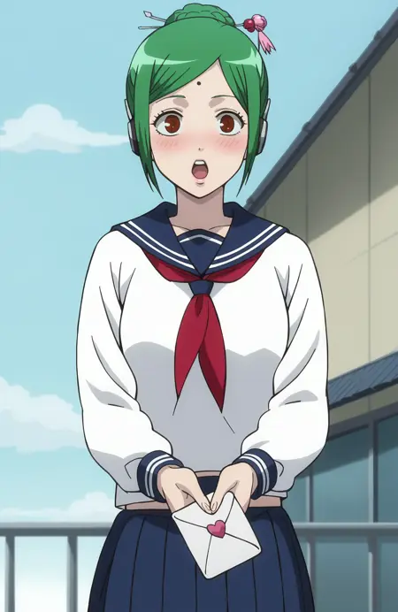 学校制服、セーラー服、スカート、緑の髪、髪を結ったスタイル、茶色の目、顔の模様、髪飾り