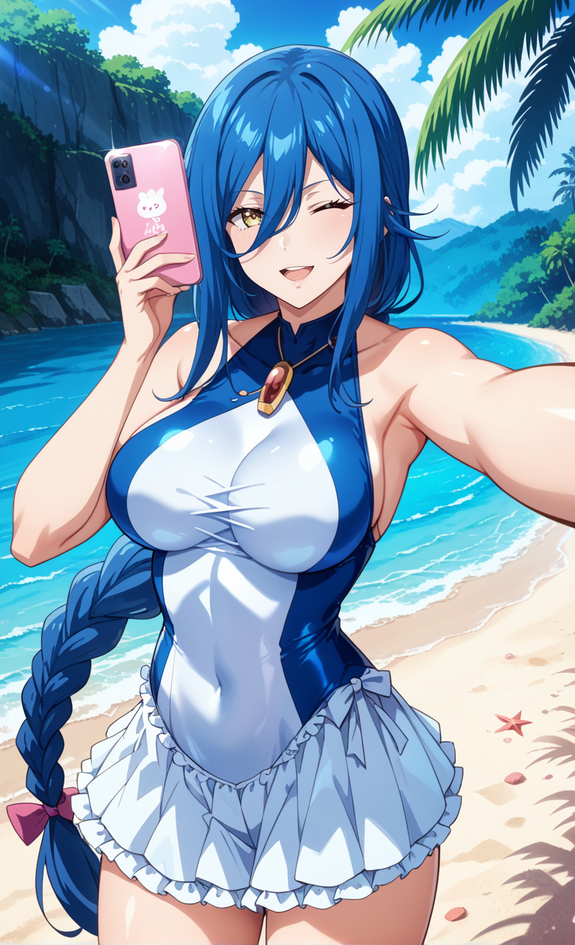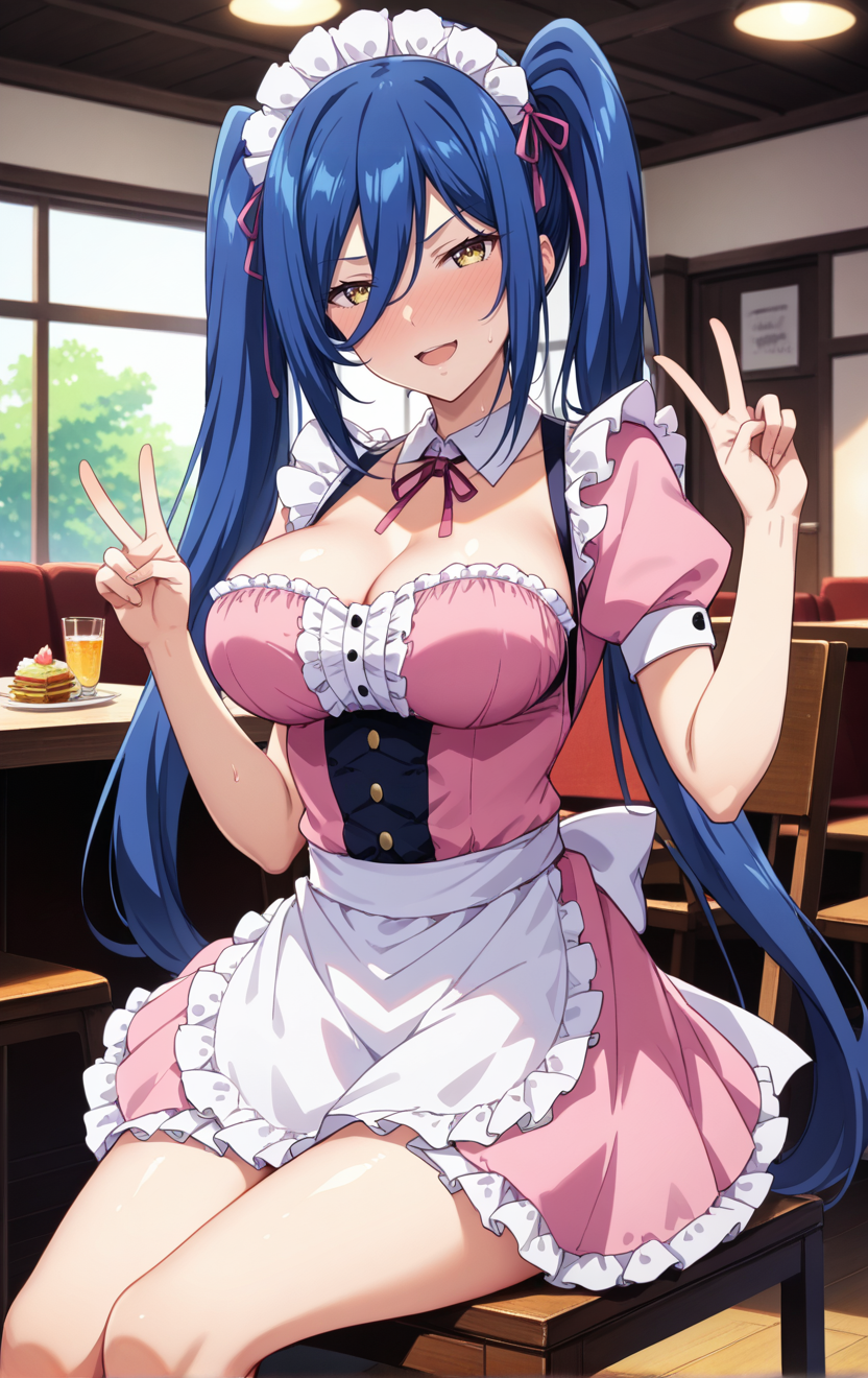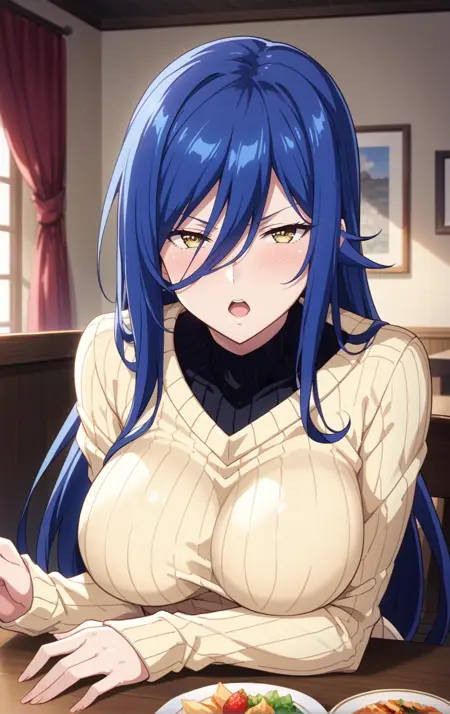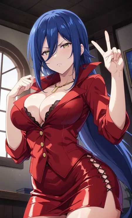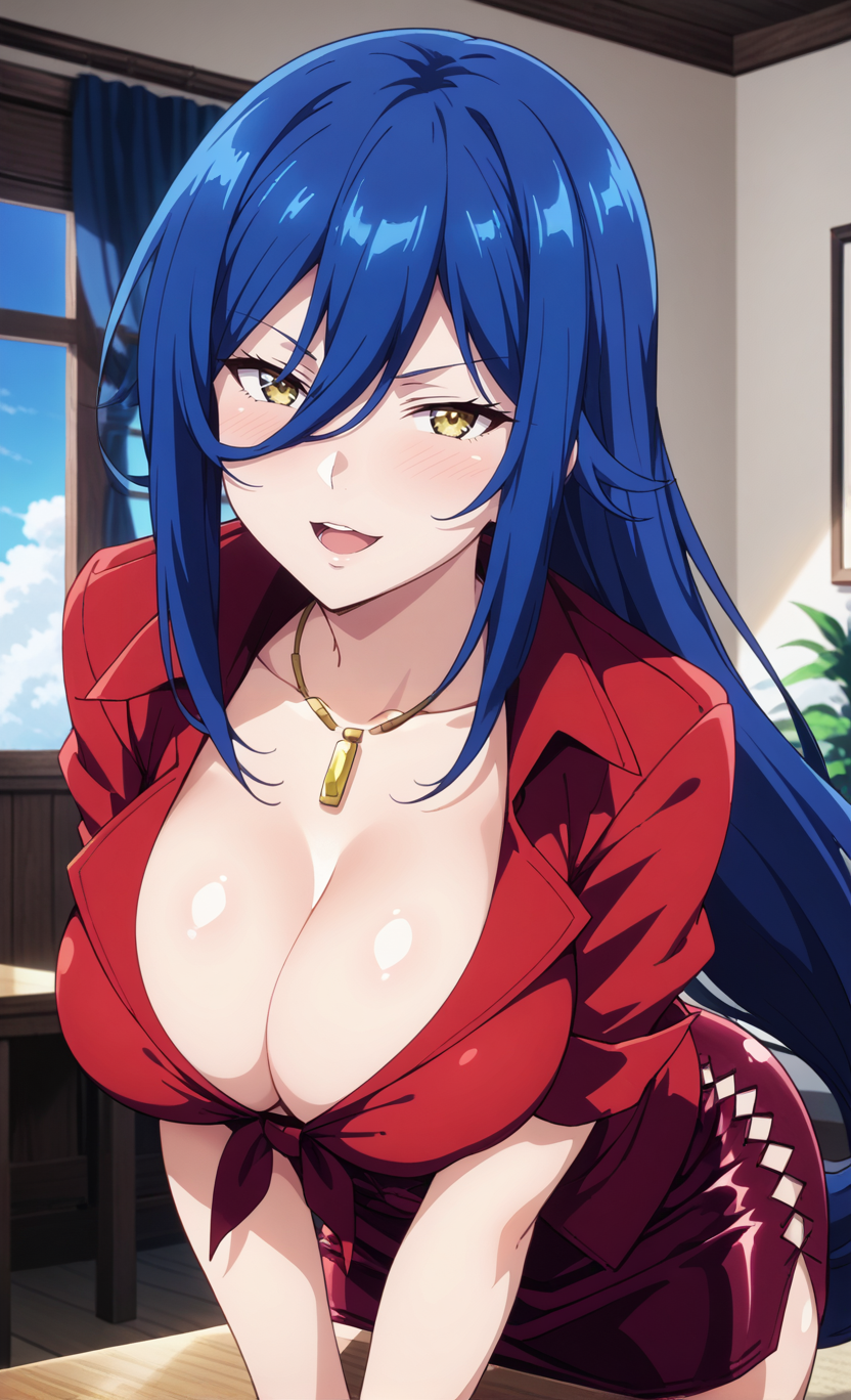 highschoolddKalawarnar, best quality, masterpiece, uncensored, 1girl,solo,long hair,hair between eyes,yellow eyes,(half closed eyes:0.9),glaring,blue hair, shiny skin,breasts,cleavage,necklace,red shirt,red skirt, pencil skirt,lora:HighSchoolDDKalawarnar4thtail\_9:1