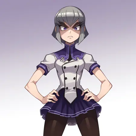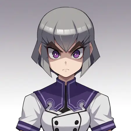 Megatron, 1girl, solo, grey hair, short hair, purple eyes, thick eyebrows,