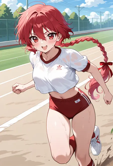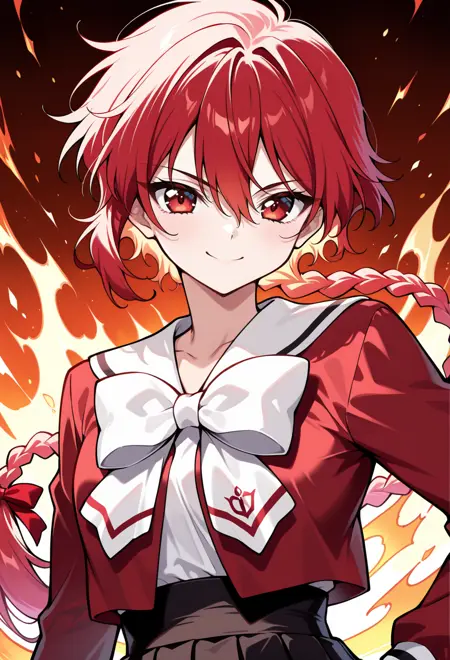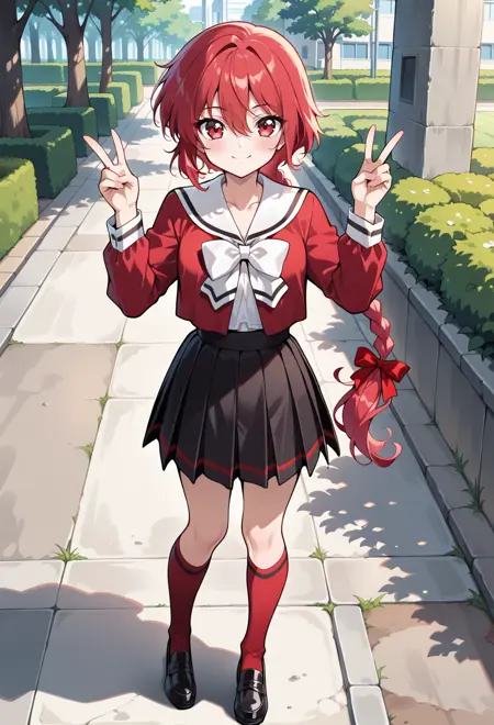 赤い目、赤い髪、編み込みポニーテール、目の間に髪、髪リボン、長い編み込み、長い髪、単一の編み込み、