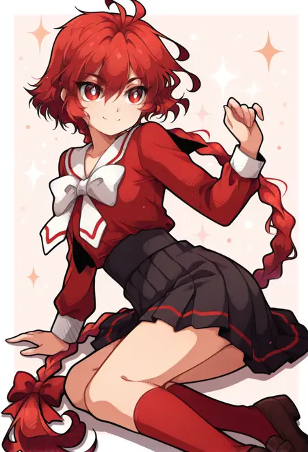 红色眼睛,红发,编发马尾,发丝垂于眼间,发饰丝带,长辫子,长发,单条辫子,