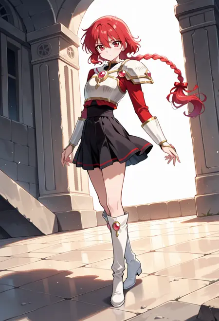 AEHikaruKnight、赤い目、赤い髪、編み込みポニーテール、目の間に髪、髪リボン、長い編み込み、長い髪、単一の編み込み、胸板、肩当て、肩甲骨アーマー、宝石、黒いスカート、ブーツ、 Kneeboots、白い靴、
