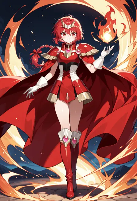 AEHikaruFinal,红色眼睛,红发,编发马尾,发丝垂于眼间,发饰丝带,长辫子,长发,单条辫子,盔甲连衣裙,红色盔甲,红色斗篷,肩部护甲,白色手套,宝石,手套,及膝靴,