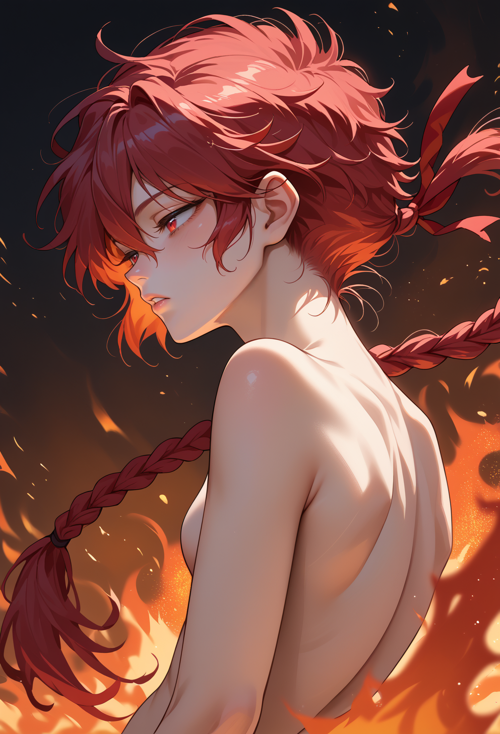 红色眼睛,红发,编发马尾,发丝垂于眼间,发饰丝带,长辫子,长发,单条辫子,