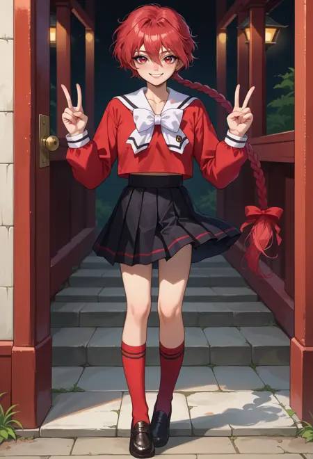 校服,水手服,白色蝴蝶结,白色水手领,红色上衣,红色蝴蝶结,丝带,长袖,黑色裙子,百褶裙,及膝袜,红色袜子,黑色鞋履,