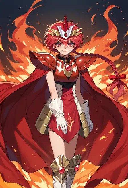 AEHikaruFinal,红色眼睛,红发,编发马尾,发丝垂于眼间,发饰丝带,长辫子,长发,单条辫子,盔甲连衣裙,红色盔甲,红色斗篷,肩部护甲,白色手套,宝石,手套,及膝靴,