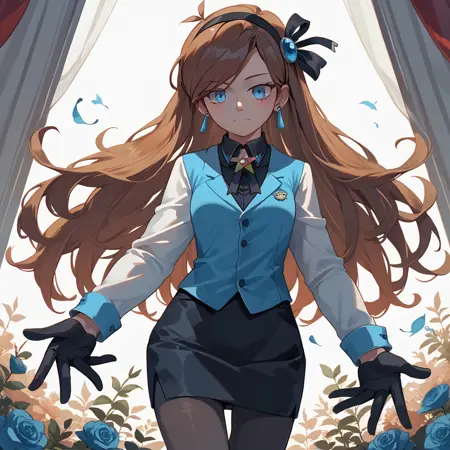 黑色发带(侧边),蓝色发饰,蓝色长条耳环,星星胸针,长袖(黑色衬衫),蓝色(背心),黑色手套,黑色铅笔裙,黑色连裤袜