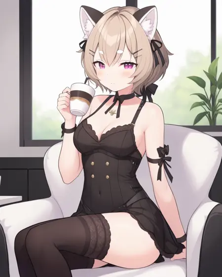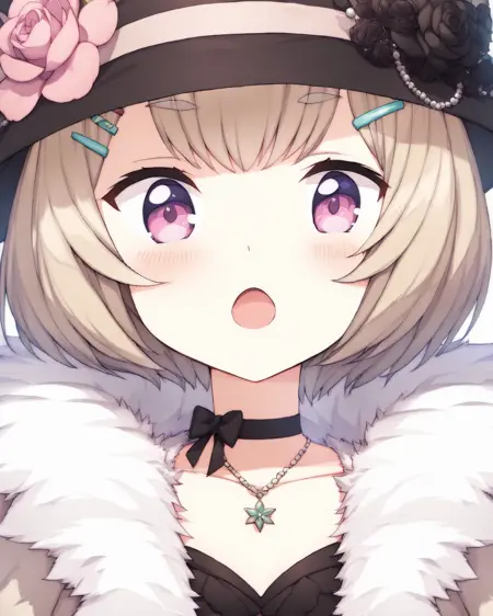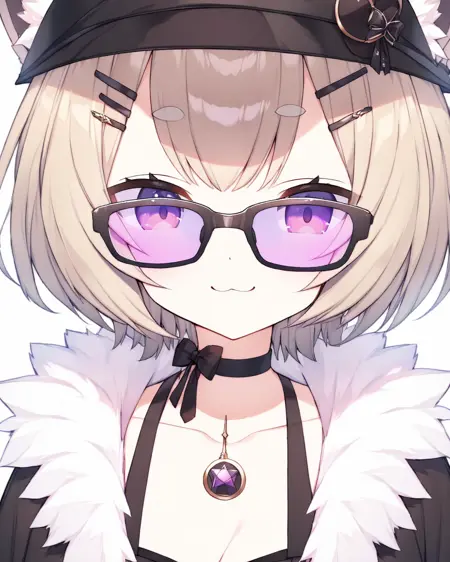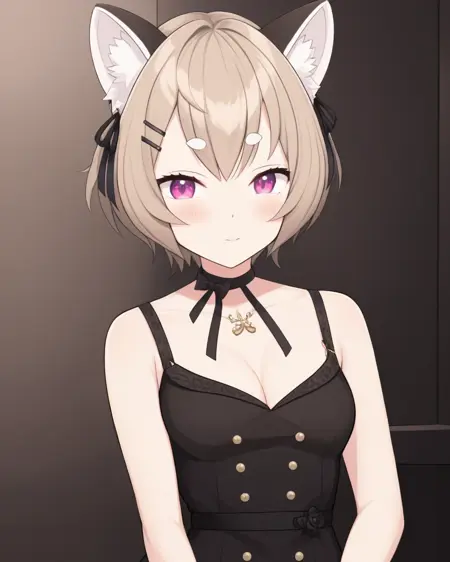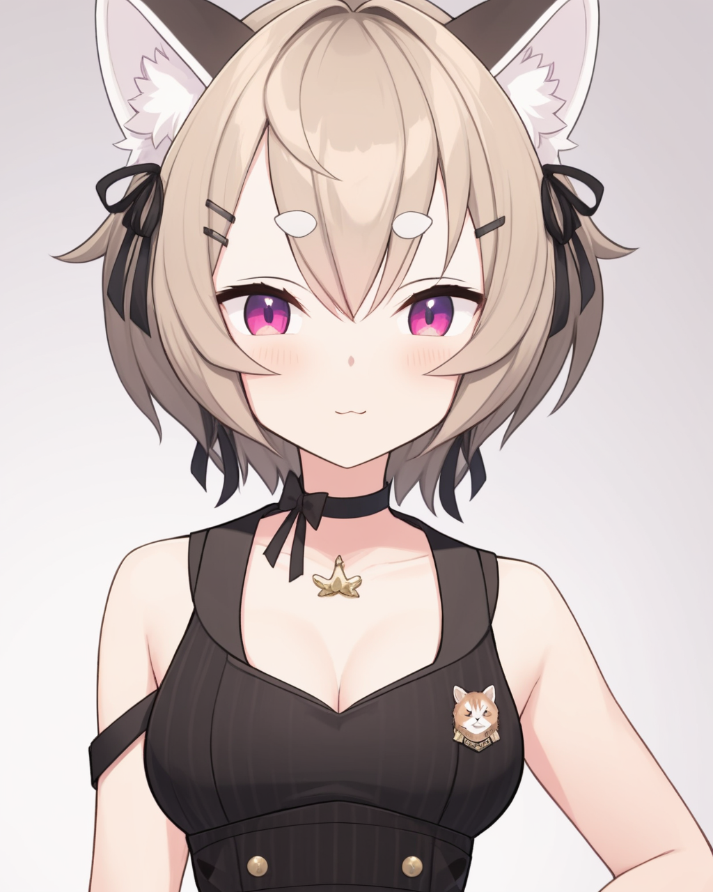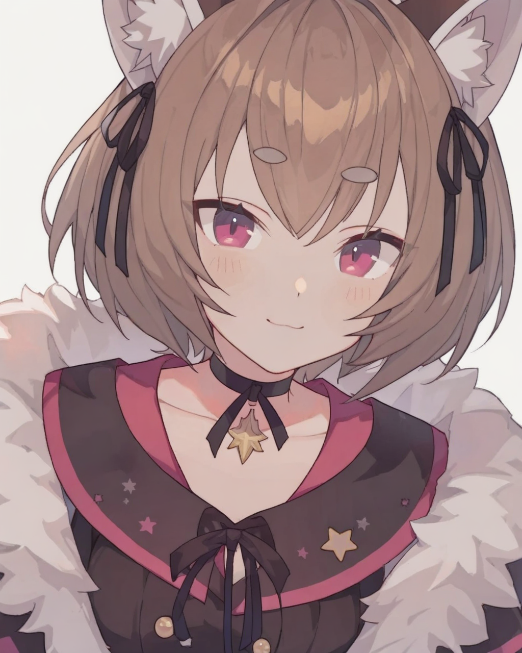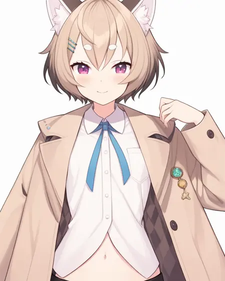 Base prompt: panko, animal ears, brown hair, hair ornament, flat chested. midriff, navel, short hair, smile, solo, virtual youtuber, upper body, tan coat,white shirt,fuschia eyes,