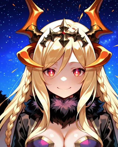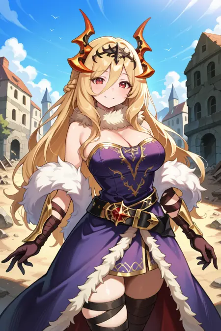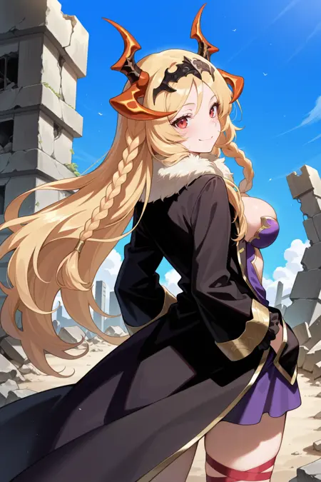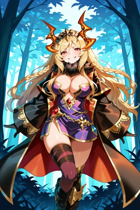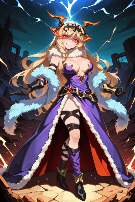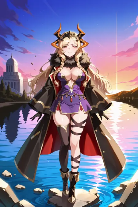 영원한 광채 리제: 1girl, 빨간 눈, 뿔, 주황색 뿔, 긴 머리, 금발, 땋은 머리, 두 개의 땋은 머리, 모피 칼라, 디아뎀, 헤드피스, 화려한 헤드피스, 검은 코트, 코트, 넓은 소매, 검은 소매, 드레스, 보라색 드레스, 짧은 드레스, 모피 소매단, 장갑, 검은 장갑, 금장식, 다리 감싸기, 비대칭적 다리 착용, 허벅지길이 양말, 부츠, 가슴, 중앙 오픈, 젖가슴,