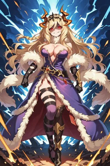 영원한 광채 리제: 1girl, 빨간 눈, 주황색 뿔, 긴 머리, 금발, 땋은 머리, 두 개의 땋은 머리, 모피 칼라, 화려한 헤드피스, 검은 코트, 중앙 오픈, 젖가슴, 넓은 소매, 검은 소매, 보라색 드레스, 짧은 드레스, 모피 소매단, 검은 장갑, 금장식, 다리 감싸기, 비대칭적 다리 착용, 허벅지길이 양말, 부츠