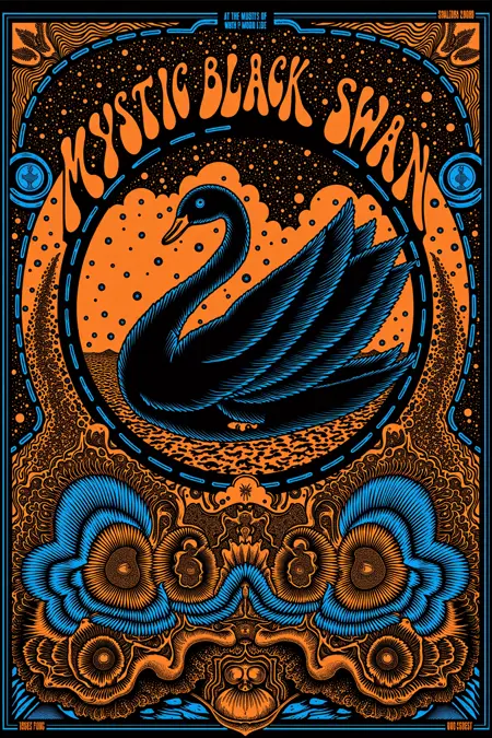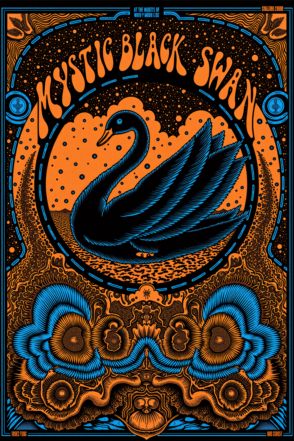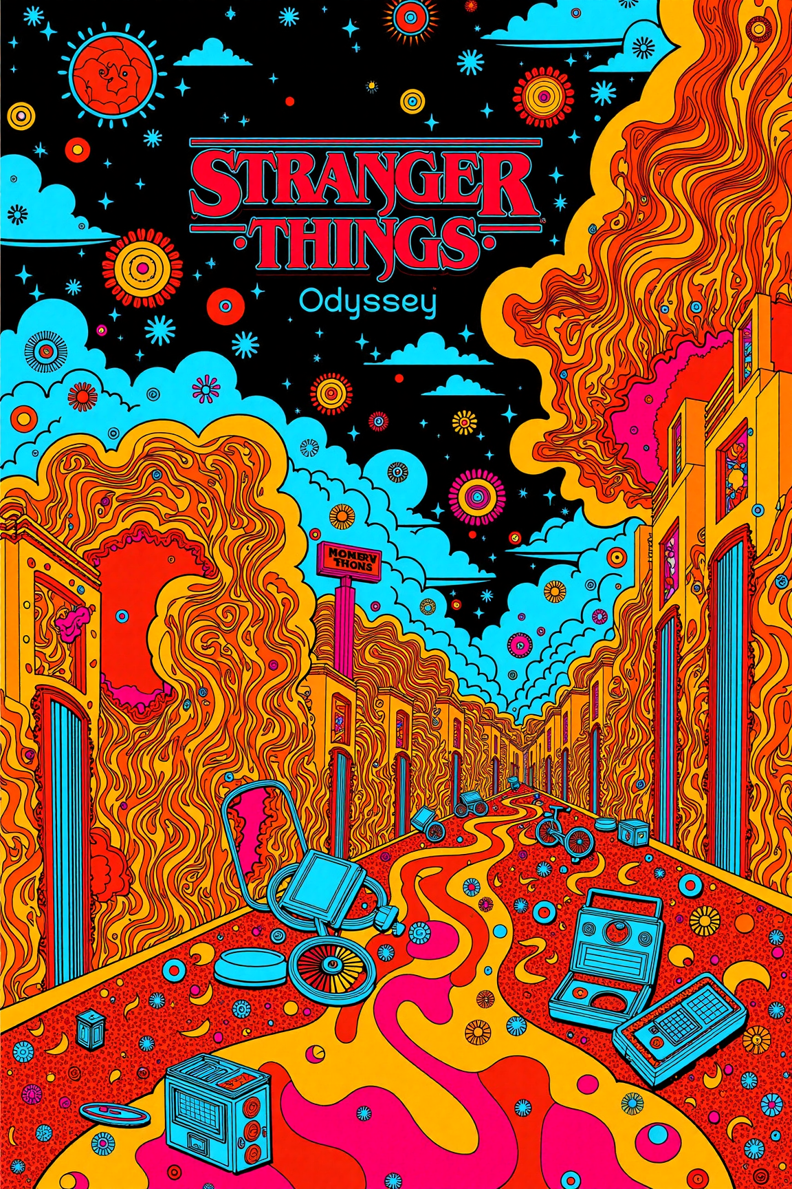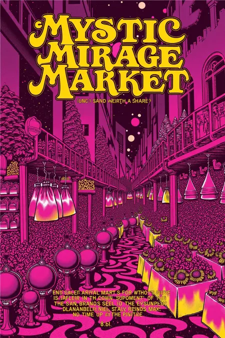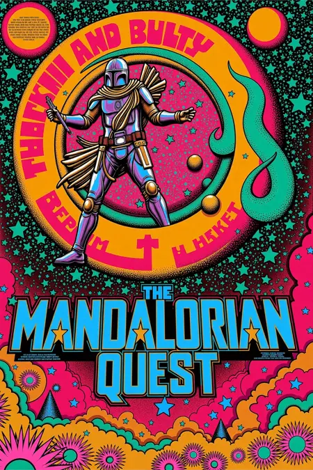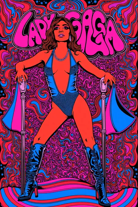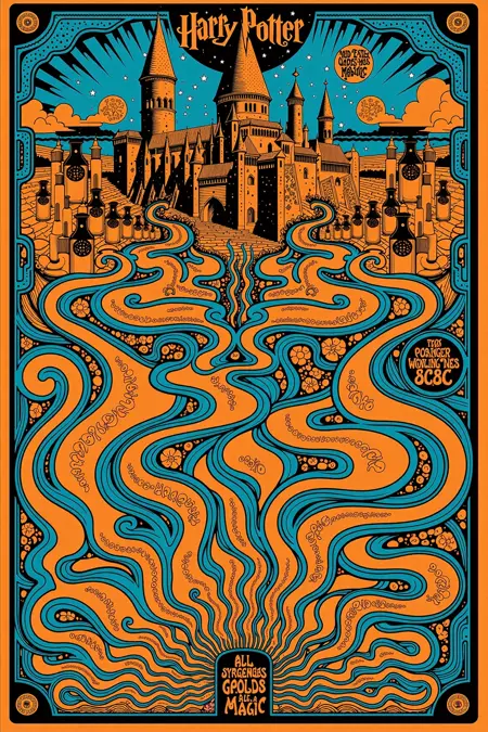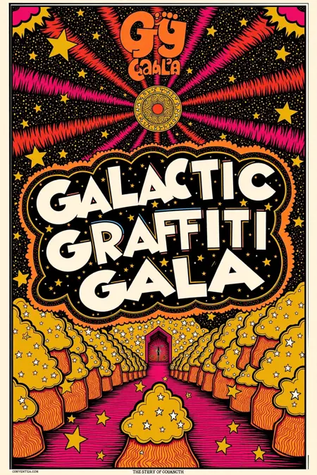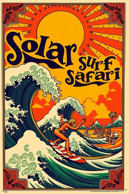 Support by prompting for: 70s psychedelic style poster, vibrant colors, abstract patterns, bright colors, etc