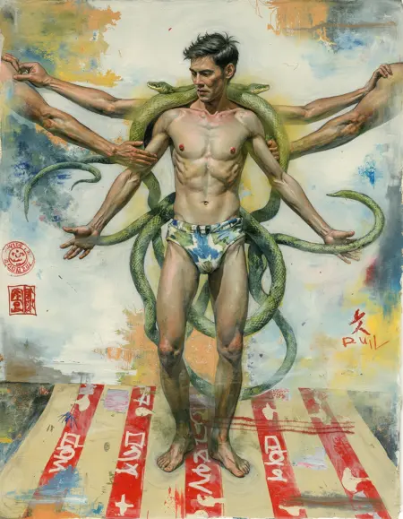 표상적 추상 표현주의는 역동적인 인간 형상과 추상적이며 감정이 풍부한 환경을 융합한 예술을 생성합니다. 이 모델은 인간 형태를 유동적이고 종종 꿈같은 설정으로 묘사하면서도 강렬한 추상적 붓터치와 정교한 디테일을 결합하여 표현적 사실주의의 본질을 포착합니다. 결과물은 생생하면서도 초현실적인 느낌을 주며, 원초적인 감정과 기술적 정교함을 균형 있게 조화시킵니다. 이 모델의 우울한 색채 체계와 심리적, 감각적 주제에 대한 집중은 예술가 켄트 윌리엄스의 작품을 연상시킵니다.