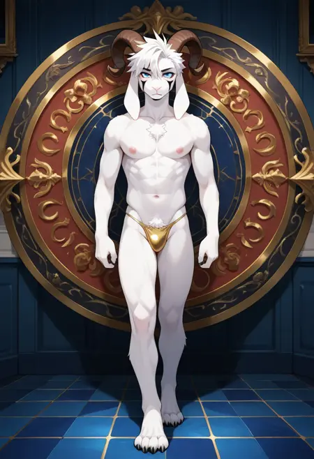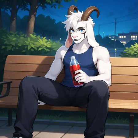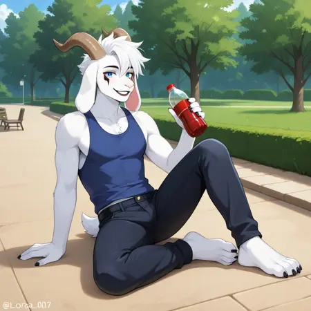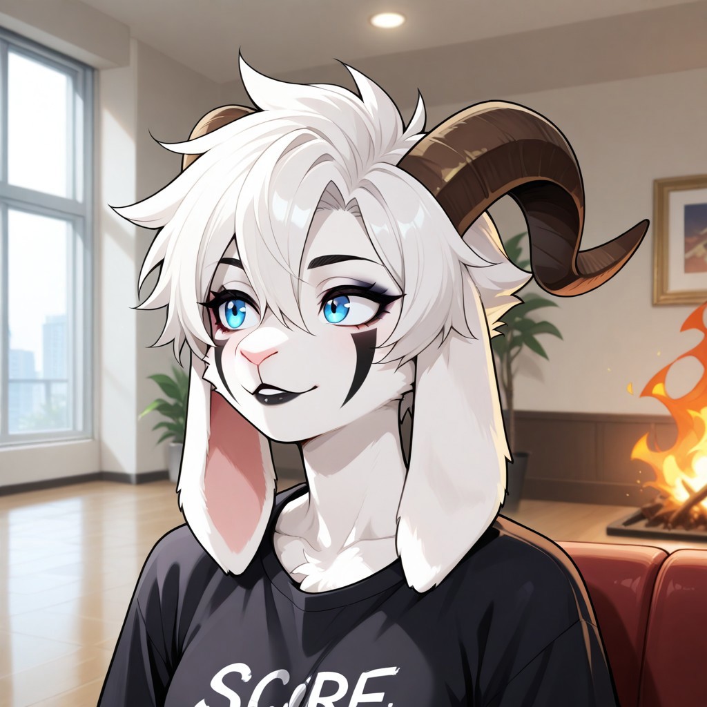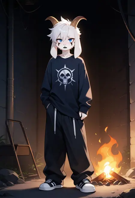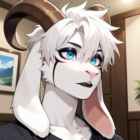 외모: 흰 털, 염소, 파란 눈, 펑크 대안 헤어스타일, 긴 처진 귀, 아이라인, 검은 립스틱, 얼굴 무늬, 코 피어싱