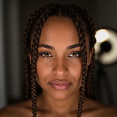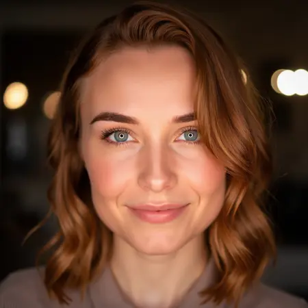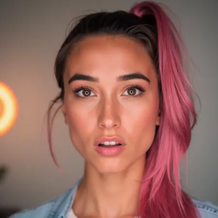 “The photograph is taken with a ring light, which creates a soft, even lighting effect around her face, highlighting her features.”