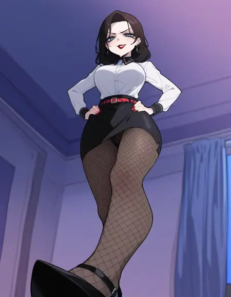 fishnets, fishnet pantyhose, shirt, pantyhose, black skirt, belt, red lips, white shirt, long sleeves, collared shirt, pencil skirt, neck ribbon, wing collar, red belt, long skirt,