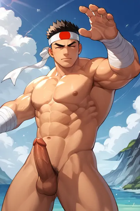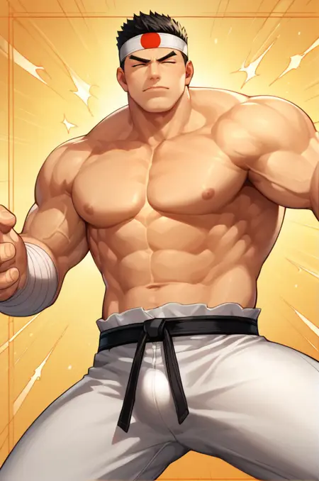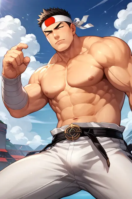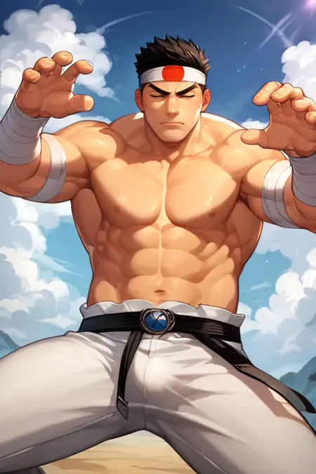 태그: Daimon_KOF, 싱글, 단발, 검은 머리, 남자아이 하나, 배꼽, 젖꼭지, 눈 감음, 남성 중심, 벨트, 바지, 복부, 근육질, 헤드밴드, 붕대, 복근, 두꺼운 눈썹, 가슴근, 근육질 남성, 바라, 큰 가슴근, 돌출부, 상의 벗은 남성, 흑색 벨트, 겨루기 자세, 흰색 바지