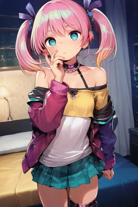 kirakira, 1girl, solo, 분홍색 머리, 트윈테일, 치마, 재킷, 어깨 드러냄, 허벅지까지 올라오는 양말, 단일 허벅지 양말, 체크 무늬 치마, 체크, 녹색 치마, 허벅지 스트랩, 파란 눈, 아쿠아 눈, 초커, 다색 머리, 보석
