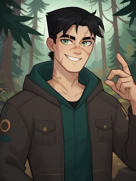 提示:Tom_DVC、男人、黑发、绿眼、夹克、疤痕、脸上有疤痕、身上有疤痕