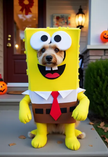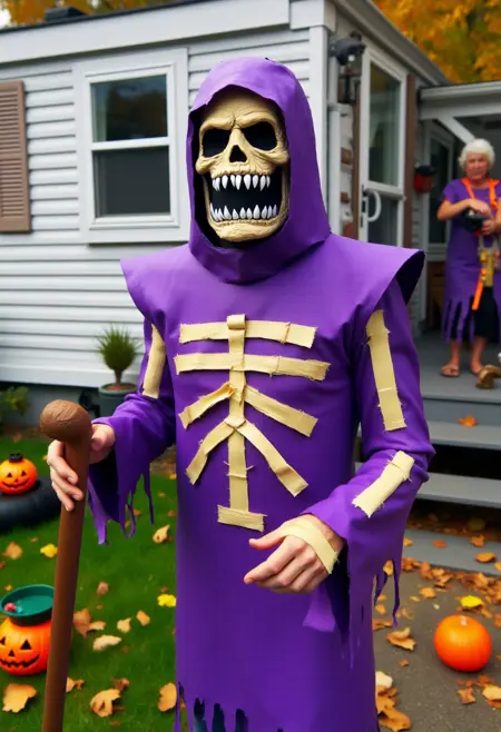 - 画像は、ハロウィンのように見える郊外の家の前で、手作りの(SUBJECT/CHARACTER)衣装を着た大人の写真である。