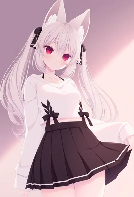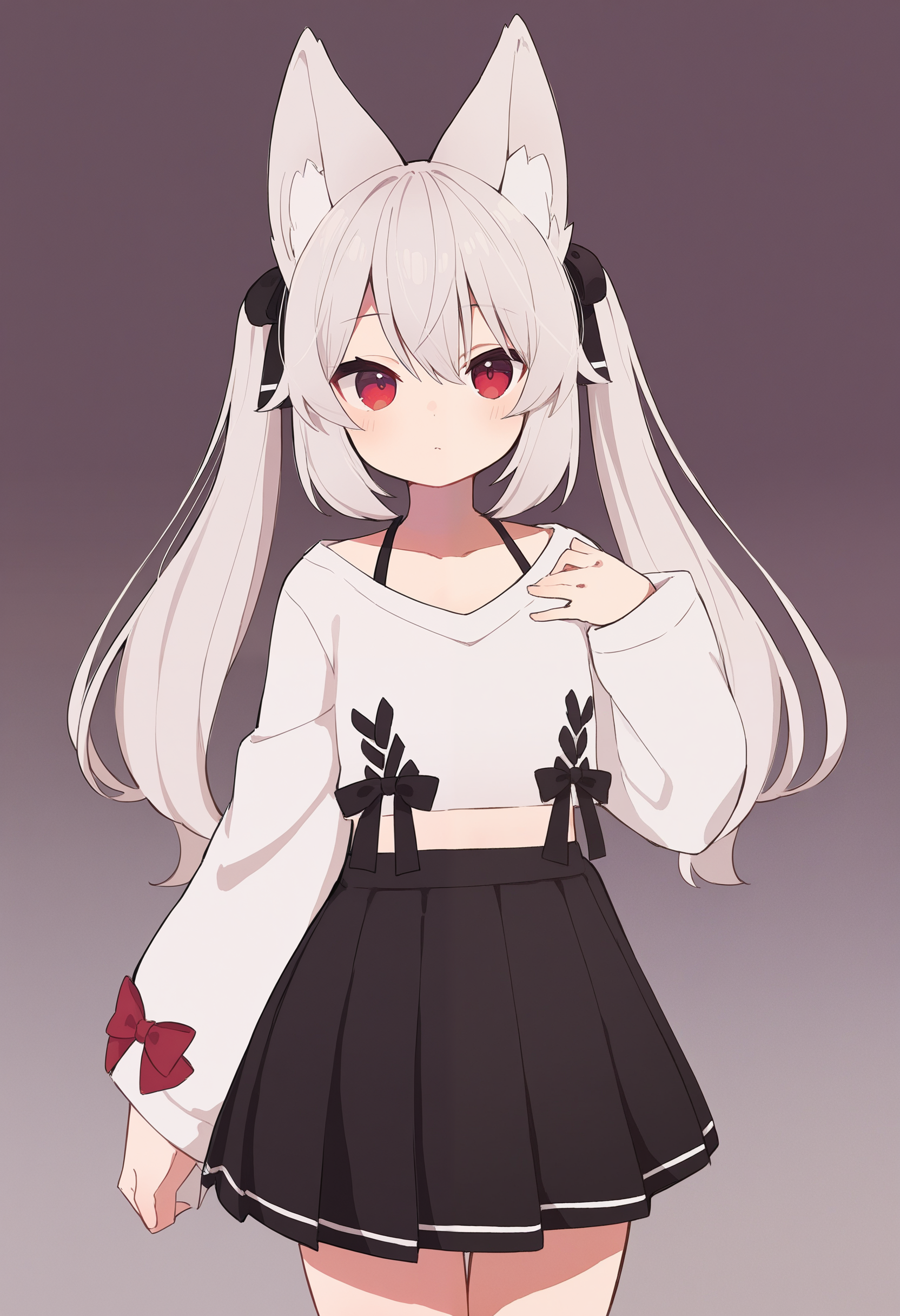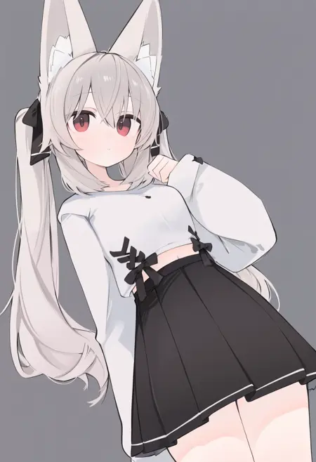prompt: karin-vrchat,animal ears, twintails, black skirt, red eyes, long sleeves, grey hair, shirt,pink_bow,black_bow,