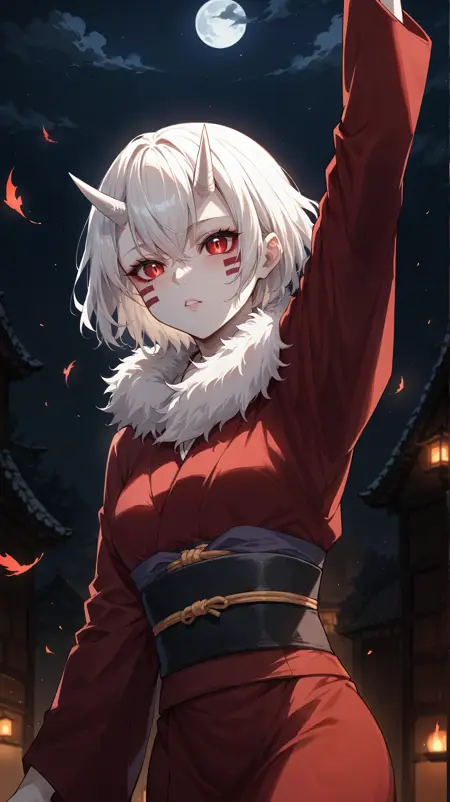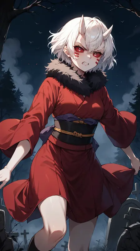pale skin, white skin, short hair, white hair, red eyes, face markings, demon, short horns, white horns, fur trim, red kimono