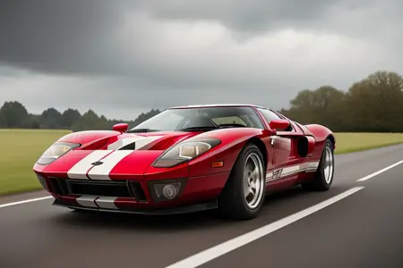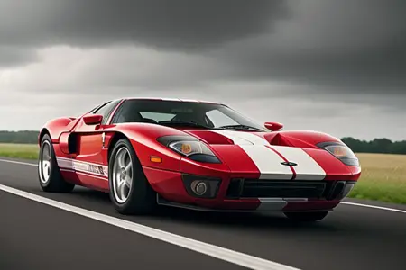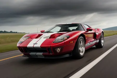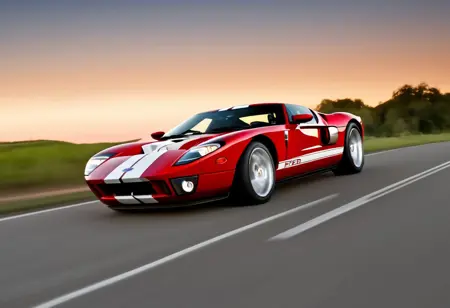 2005款福特GT,红白配色或红色车身配白色条纹,后四分之三视角,行驶在草原公路上,夕阳天空,动态模糊