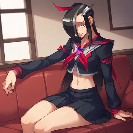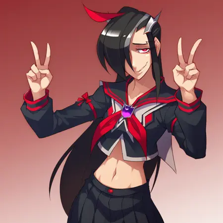 StarScream, 1girl, solo, black hair, hair over eyes, red eyes,