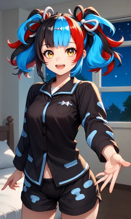 sei_shonagon_fgo,黄眼睛,多彩头发,红发,蓝发,黑发,双马尾,长发,蝴蝶结,发夹