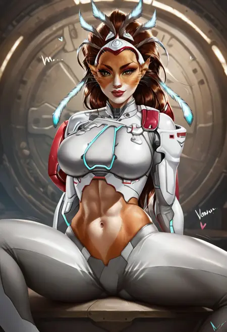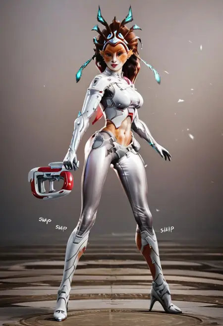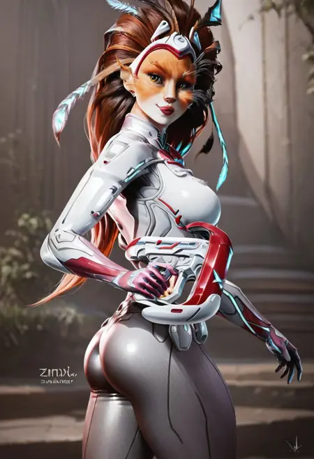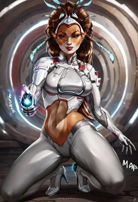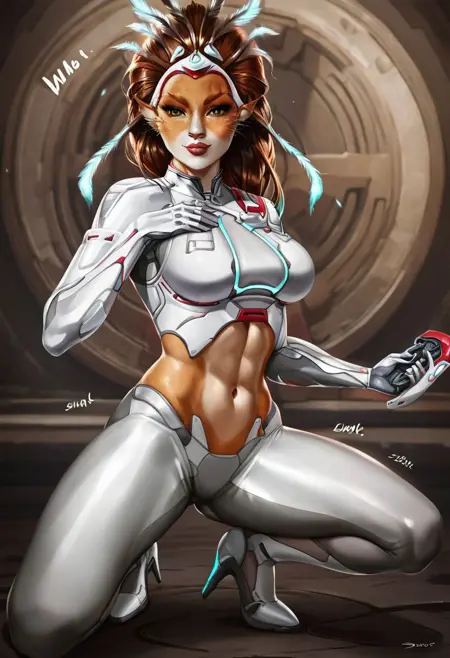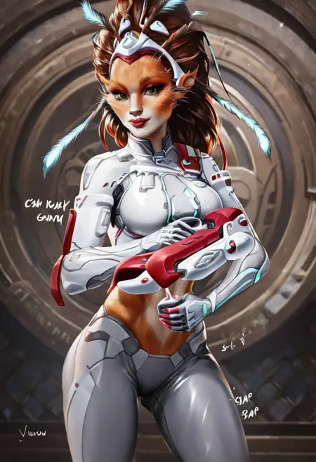 ZinxParagon,1girl,solo,anthro,furry female,brown hair,large breast,long hair,hair ornament,bodysuit,high heels,navel,gun,lips,gloves,white suit,armor,colored skin,animal ears,whiskers,