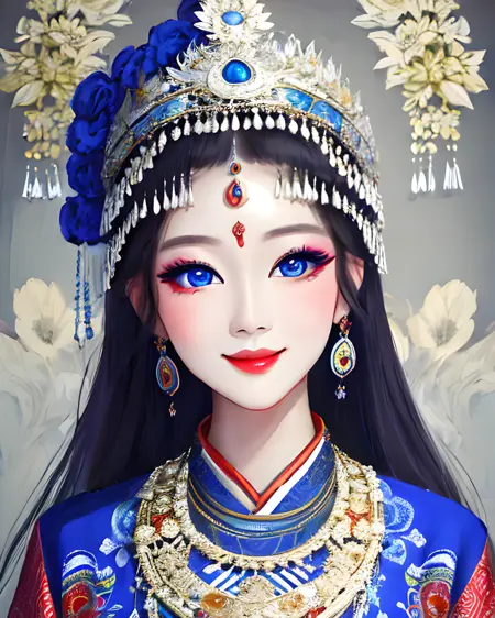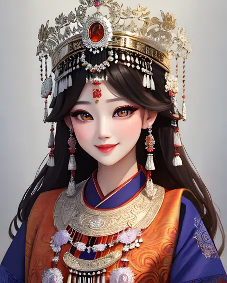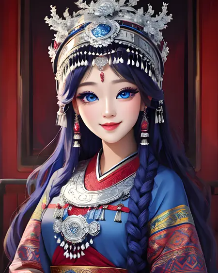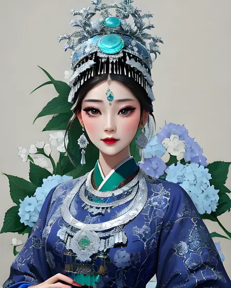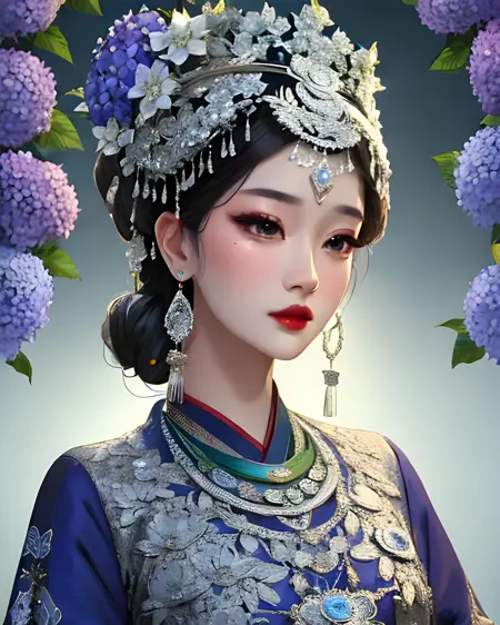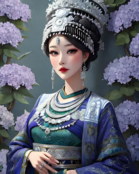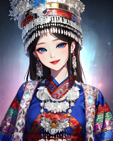 一个允许你生成苗族风格传统服饰的 LoRA。苗族是中国及周边其他国家的一个少数民族,因其华丽的银质头饰而闻名。这些头饰极为复杂,因此生成结果会接近真实作品,但未必完全准确。你也可以尝试降低 LoRA 权重,并调整提示词,创造出更具幻想风格的头饰,以精湛的工艺为灵感。