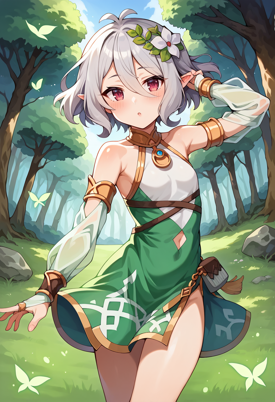 - pcrkok, 회색 머리, 엘프, 안테나 머리, 평평한 가슴, 붉은 눈, kkpdress, 머리 장식, 머리 꽃, 흰 로브, 어깨 노출, 소매 없음, 옷 자국, 배꼽, 요정 날개, 글라디에이터 모래신,