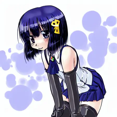 기본: 98 헤어클립, 네이비 블루 짧은 넥타이, 민소매 흰색 블라우스, 네이비 블루 치마, 어두운 색 신발, 허벅지까지 오는 네이비 블루 양말, 네이비 블루 긴 장갑