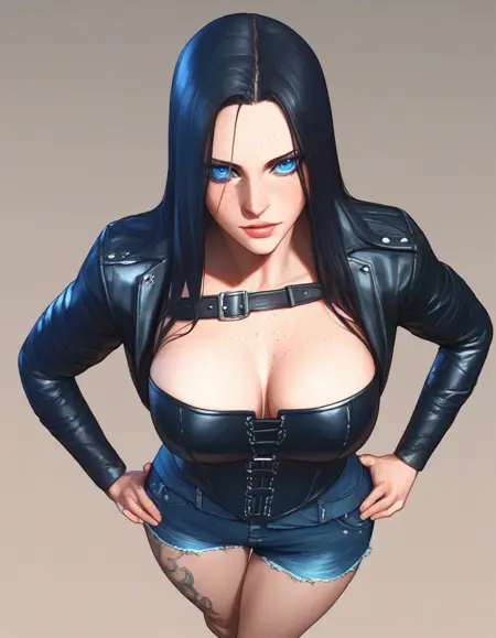 score_9, score_8_up, score_7_up, score_6_up, Fl00rnime, 1girl, solo, black hair, blue eyes, long hair, 8k, looking at viewer, lora:Fl00rnime-15:1, freckles, smiling