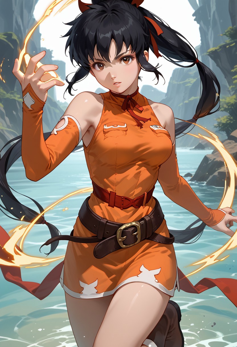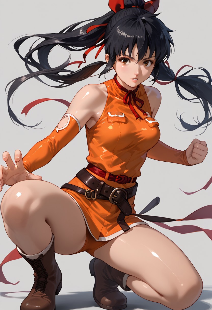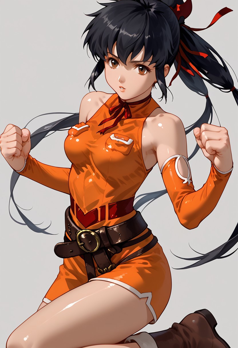 detached sleeves, bare shoulders, ribbon, belt, hair ribbon, elbow gloves, dress, sleeveless, orange shirt, boots,