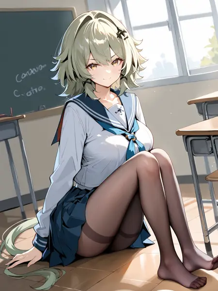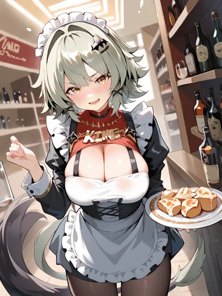 她的默认游戏内女仆服装额外提示词:黑色过膝袜、机械臂、铅笔裙、毛边夹克、手臂露出袖口、角、x发饰、发夹、高领毛衣、护膝、踝靴