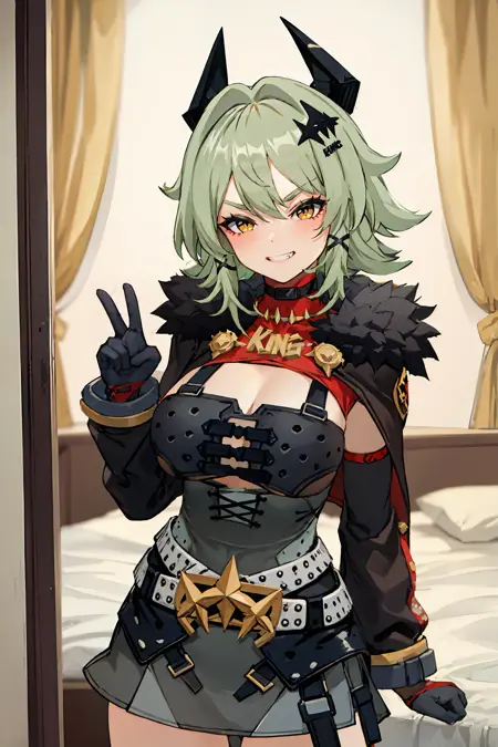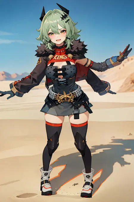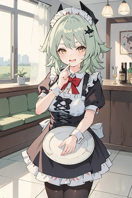 她的默认游戏内女仆服装额外提示词:黑色过膝袜、机械臂、铅笔裙、毛边夹克、手臂露出袖口、角、x发饰、发夹、高领毛衣、护膝、踝靴